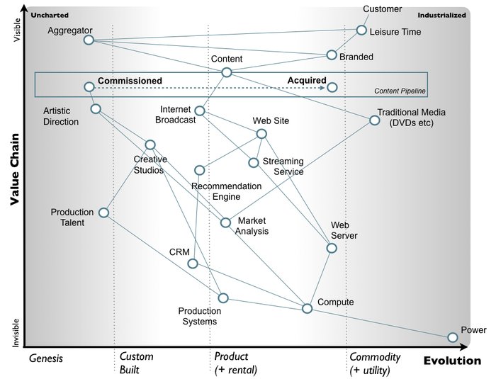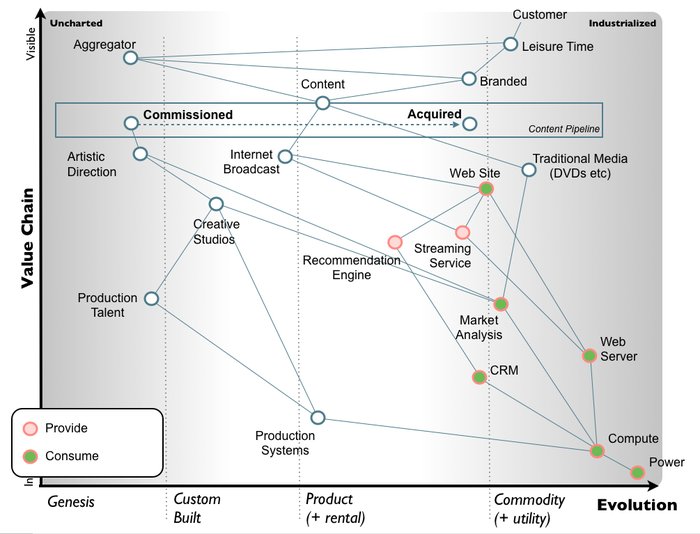 All the components in the above map are evolving from left to right due to supply and demand competition. As they evolve their characteristics change from an uncharted domain (the uncertain, rare and constantly changing) becoming more industrialised (the known, the common, the stable). For example, power supply is something commonplace and well understood. We all know how to use a plug and switch on a socket. However, creative studios and the art of creating a TV show is less common and less well understood, it is more a source of wonder and amazement for many. It should be remembered that power supply was itself a source of wonder and amazement back in the 1890s.
