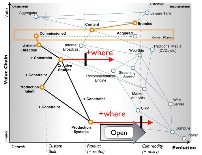 Fortunately, creative studios themselves have constraints in terms of production talent and production systems. By driving production systems to more of a commodity (ideally through an open approach) then you can reduce these constraints and encourage more creative studios to form, hence driving creative studios to more of a commodity. The beauty of this approach is that creative studios are likely to support you in your efforts because production systems will be seen as a cost to the business rather than a barrier protecting the business. I say 'likely' because if the creative studios had good situational awareness then they'd see this obvious play coming from a mile off. Chances are they won't, they'll actively support it.