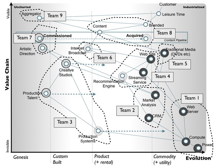 From the map, we have already identified the user need (the “visible” elements at the top of the map), we know the components involved in creating those needs (the value chain), we’ve got some idea of the context and how evolved the components are and we’ve challenged the map by identifying any bias we might have in the treatment of components. We’ve worked out that other groups have built several components and these are things we should consume from them. We’ve also agreed with other groups that several components (streaming engine, recommendation engine) we could look to provide.