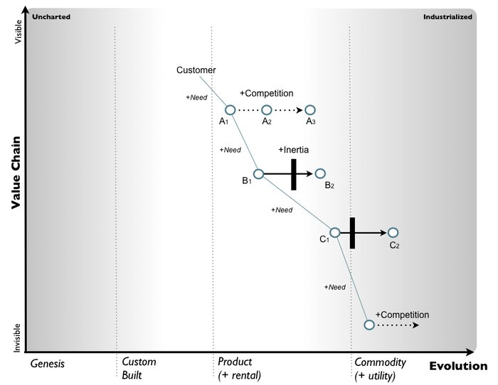 Now, every component is evolving from the uncharted space to becoming more industrialised through the effects of supply and demand competition. Hence activity A evolves from A1 to A2 to A3 etc. Most of the time such evolution is sustaining i.e. it involves incremental improvements in the act e.g. a better phone.