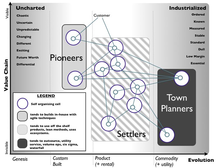 Then in these exceptional circumstances you can build a settler structure by outsourcing your pioneering capability to the outside world along with the component supply chain. In this type of structure you purely manage and exploit the flow from the uncharted to industrialised. You're still really a three party structure just you've outsourced two of the parts.