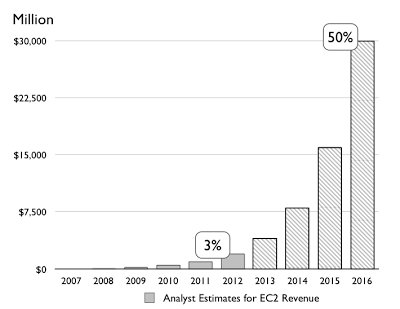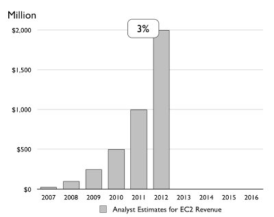 If (and it is a big if) the median estimate is close then Amazon Web Services currently generates a forward revenue equivalent to around 3% of the Worldwide server sales. Of course, AWS is more than just servers but I'll use this as my benchmark.
