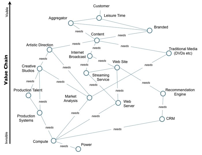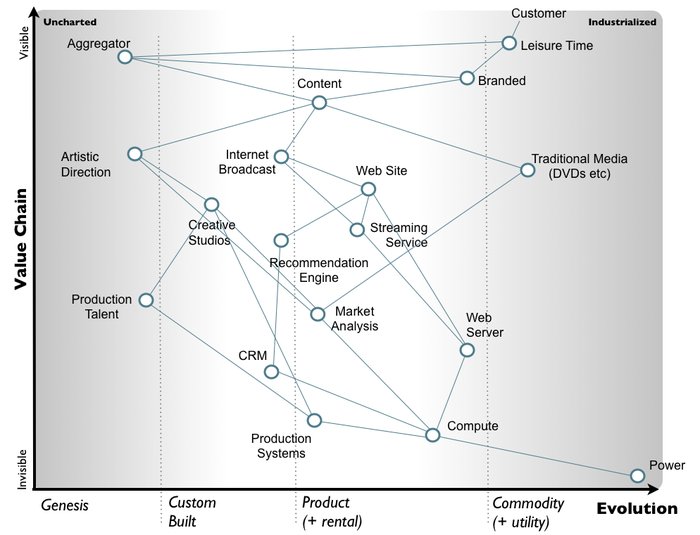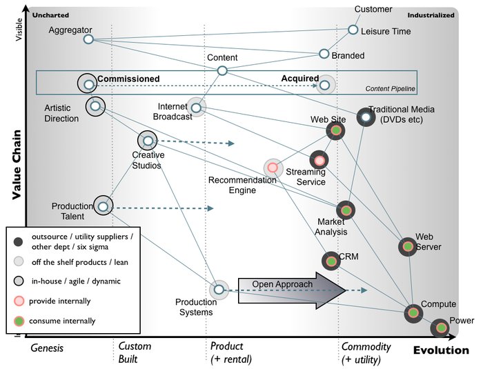 All the components in the above map are evolving from left to right due to supply and demand competition. As they evolve their characteristics change from an uncharted domain (the uncertain, rare and constantly changing) becoming more industrialised (the known, the common, the stable). For example, power supply is something commonplace and well understood. We all know how to use a plug and switch on a socket. However, creative studios and the art of creating a TV show is less common and less well understood, it is more a source of wonder and amazement for many. It should be remembered that power supply was itself a source of wonder and amazement back in the 1890s.