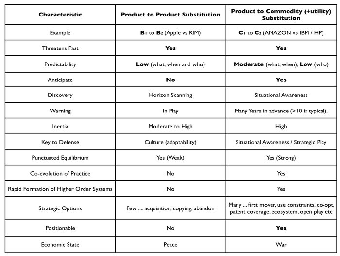 I need to emphasise that product to utility substitution gives you ample warning in advance, often ten years or more. However, this assumes you have reasonable levels of situational awareness and it's situational awareness that is the key to defence. If you exist in a firm which has little to none (the majority) then even that which you should anticipate comes as a complete shock. Even if you have the situational awareness necessary to see the oncoming storm then you'll still need to manage the inertia you have to change but since you've got lots of warning then you can prepare.